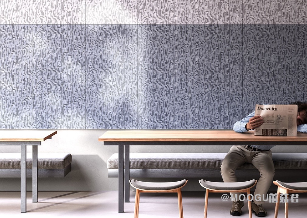 MOOGU轻薄墙面声学美饰面板具有吸音性能。一个革命性的全新系列,完全环保的面板,将惊人的自然技术与人类的聪明才华和工程学相结合。一款开创性产品,能够为所有内饰提供创新和自然的外观,同时凭借其独特的美学和声学性能改善酒店、商场、办公室的舒适性。